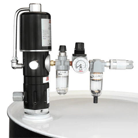 This 5:1 Piston Pump was built with professionals in mind and was designed to be used with low, medium, and high viscous oils such as motor oil, transmission fluid, hydraulic oil, and more! This versatile pump can be mounted on various container sizes such as 16-gallon, 55-gallon, and 275-gallon containers when used with the appropriate suction tube making this pump adaptable with the needs of your shop. The ZE1731K includes an adapter for mounting onto containers using a 2” NPT bung adapter and Filter Regulator/Lubricator.